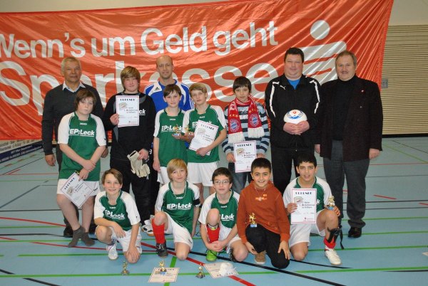 Sieger bei den E – Junioren – der TSV Tann. Hinten von links, Geschäftsstellenleiter der Sparkasse Triftern, Andreas Richter, Turnierorganisator Anton Stapfer, Trainer Josef Ostermeier u. TSV Vorstand Franz Altmann, sowie die Spieler, Elias Unterhuber, Sascha Negucic, Lukas Springs, Steven Petersen, Florian Kastrati u. Lukas Mörtl