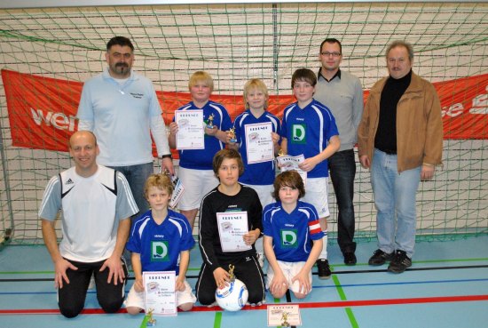 | Sieger bei den F II Junioren- die TSG Postmünster. Stehend h. Orga – Leiter Anton Stapfer, Trainer Christian Dirnaichner, JL TSV Triftern Fred Schraml, 2 Betreuer Postmünster, TSV Vorstand Franz Altmann. Im Kader der TSG Postmünster waren: Langgartner Timo, Reiter Fabian, Bauriedl Max, Dorfner Simon, Dirnaichner Pascal, Burner Lukas, Haneder Jonas und Edmaier Jakob