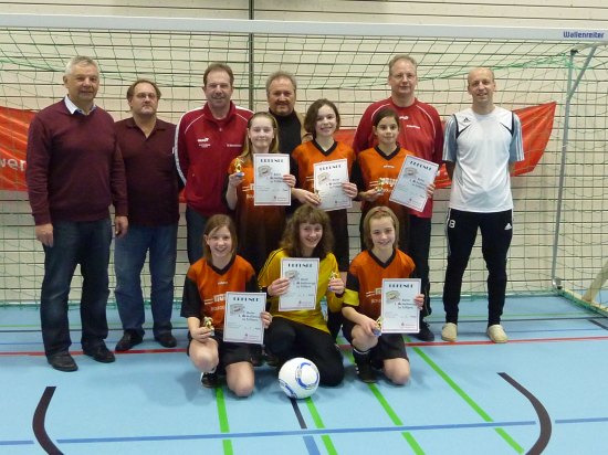 | Sieger bei den U 13 Juniorinnen - der SV Mariakirchen. Stehend hinten v. links: Bürgermeister Walter Czech, Jugendleiter Alfred Schraml,Trainer Büchner Johann, 1. Vorstand des TSV Triftern - Franz Altmann, Betreuer Gottfried Wittmann; im Kader des FC Mariakirchen waren: Bittner Regina, Jahrstorfer Julia, Wittmann Lisa Maria, Unger Magdalena und Mayr Sarah. |